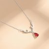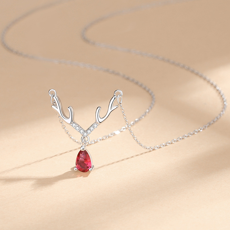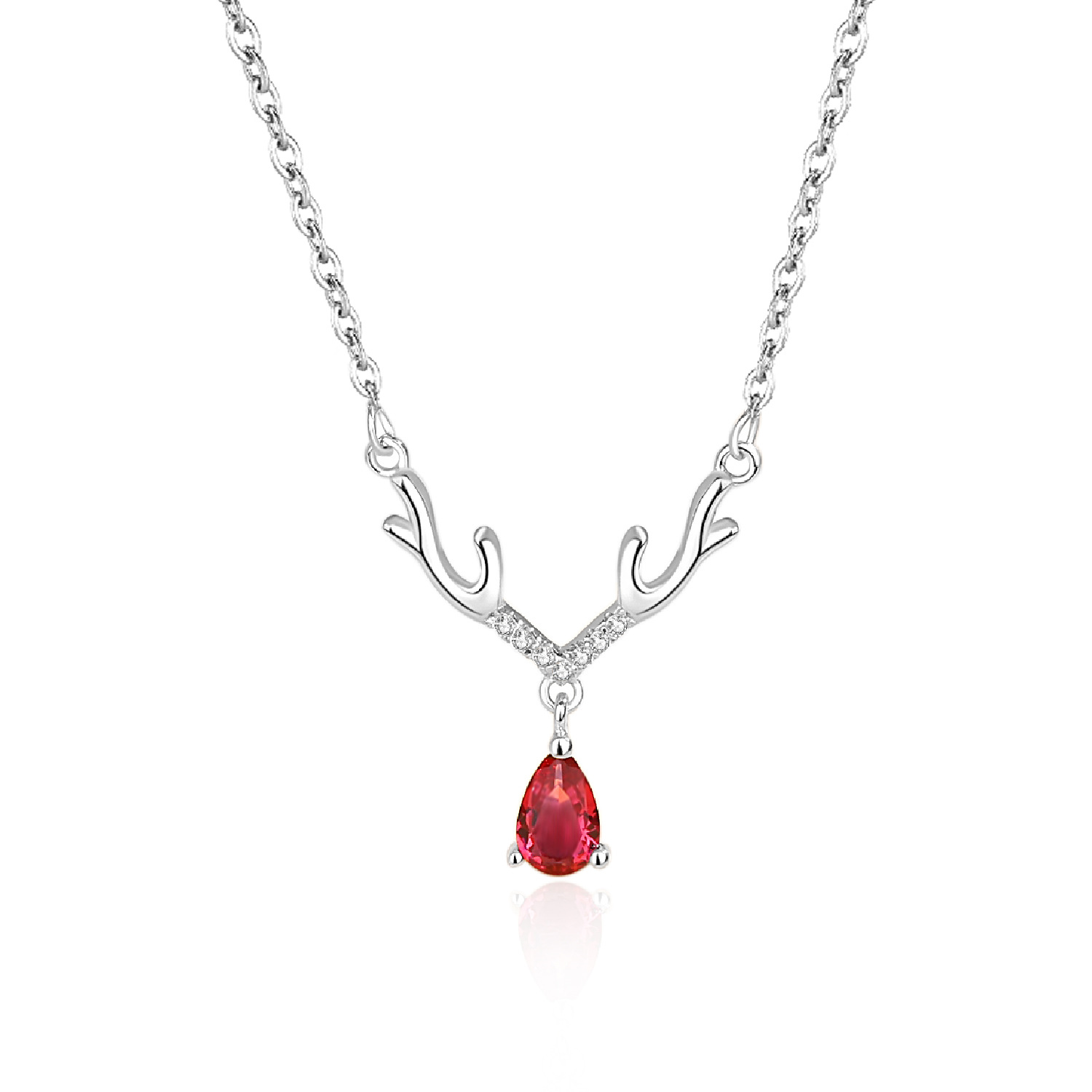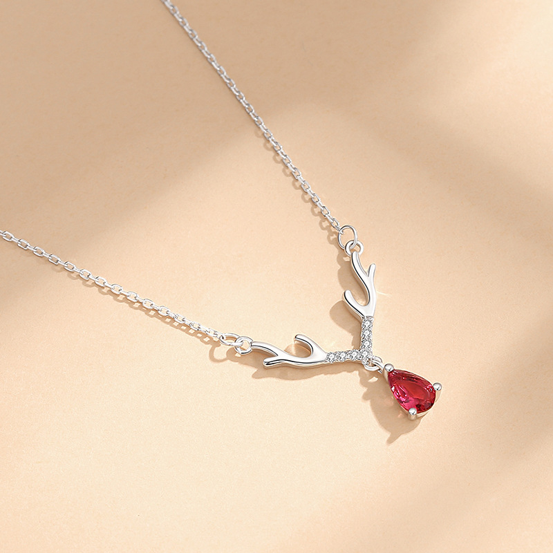 Versatile Drop Red Zircon Pendant Necklace 925 Sterling Silver Elk Deer Antler Clavicle Chain for Christmas and New Year Gifts