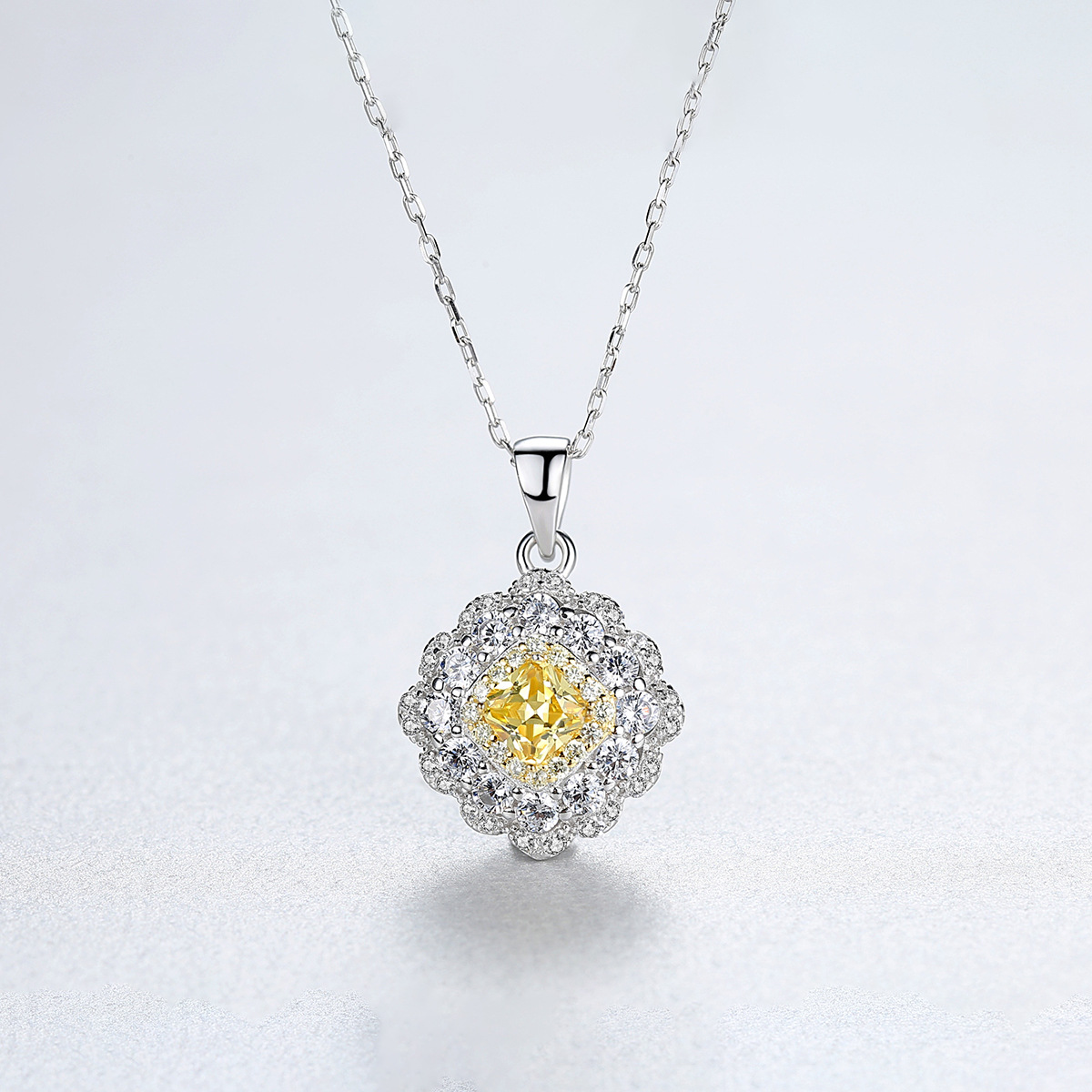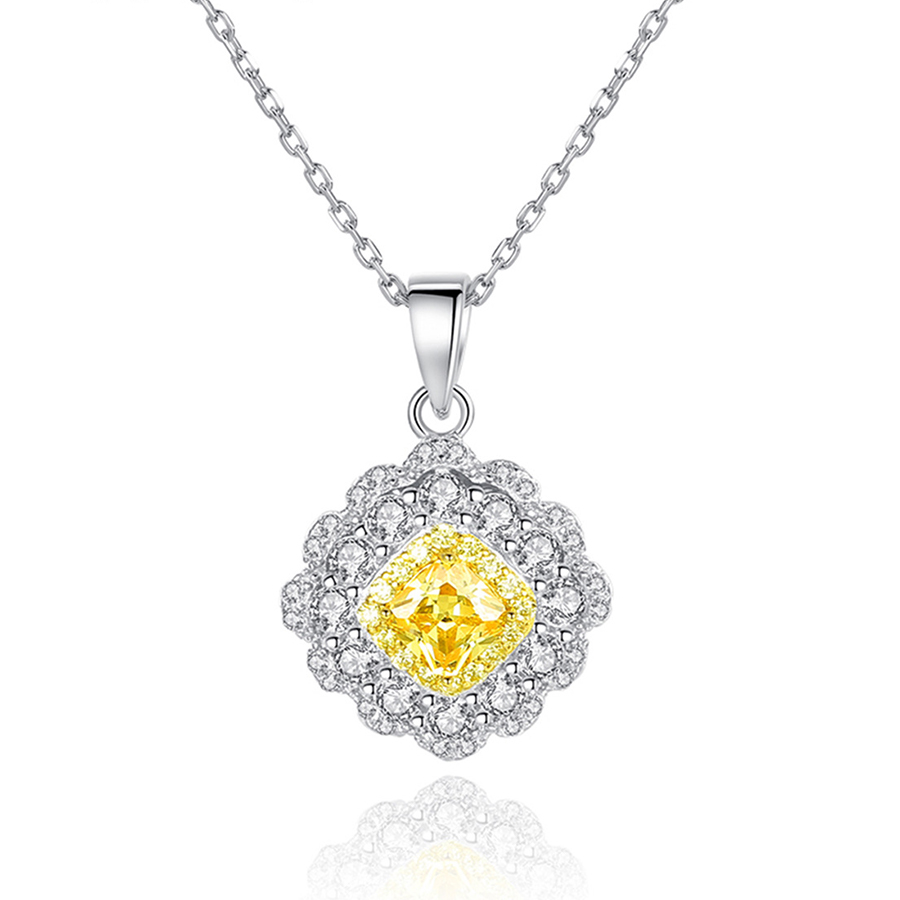 Light Luxury Full Diamond Flower Clavicle Chain 925 Sterling Silver Fine Jewelry Yellow Zirconia Square Pendant Necklace